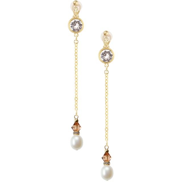 シンプルなパールのイヤリングに華奢なチェーンを付け、先にスワロフスキーを垂らしました。 上品で控えめで印象アップ間違いなし!