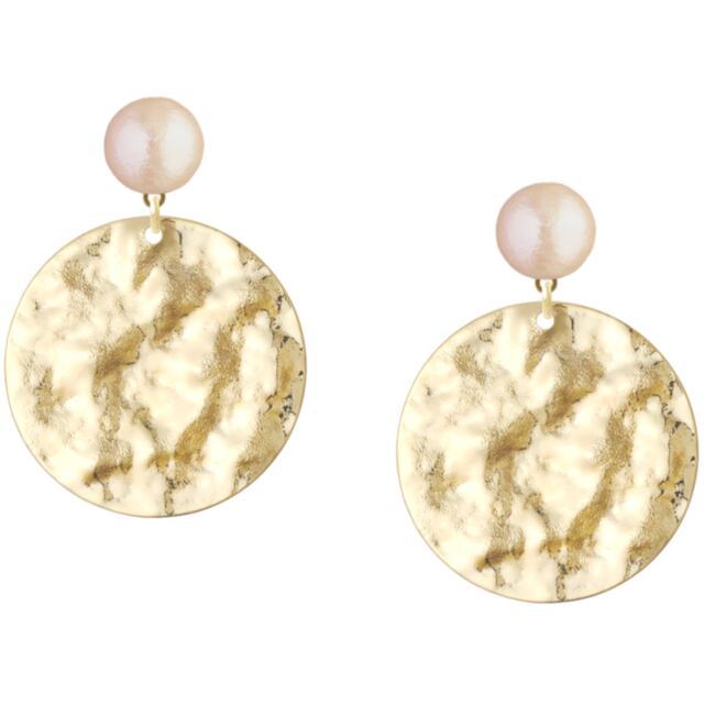 人気のホワイトパールとゴールドメタルのシンプルでオシャレなピアスです。 メタルは表面に凹凸の加工が施され、複雑な光を放ちます。大人っぽく、個性的でセンスの光るピアスです。