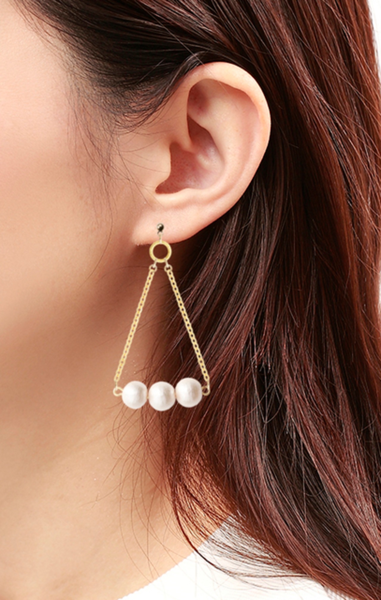 ゴールドのシンプルなピアスに3つの連なったパールをぶら下げました。